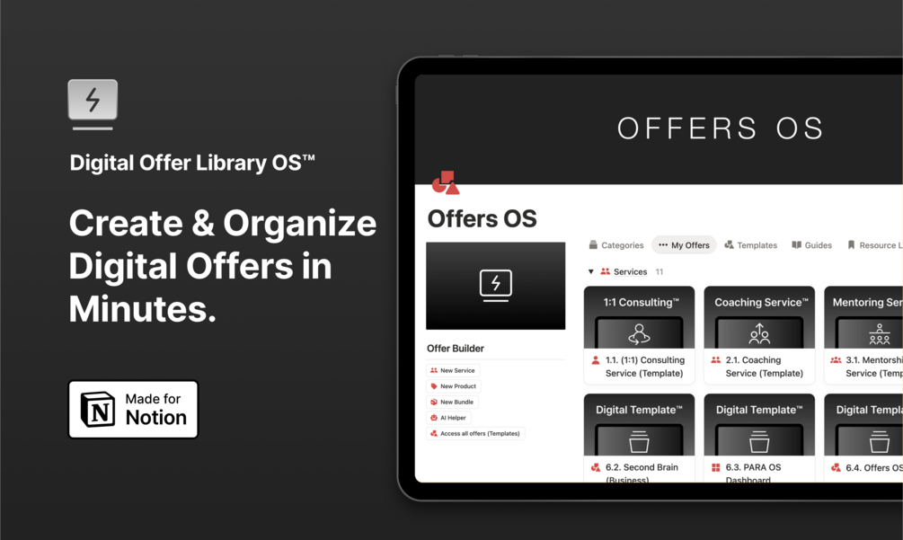 Offers OS™ — Digital Library™ Second Brain is the ultimate solution for designing, building, and organizing your digital offers in Notion. With 7 areas, 15 subareas, and a Digital Offers Library including 18 specific templates, this template enables you to develop intensive services, digital products, and more in seconds. Perfect for consultants, coaches, and creators, it optimizes your offer development and provides a solid foundation to manage your digital business comprehensively and efficiently.