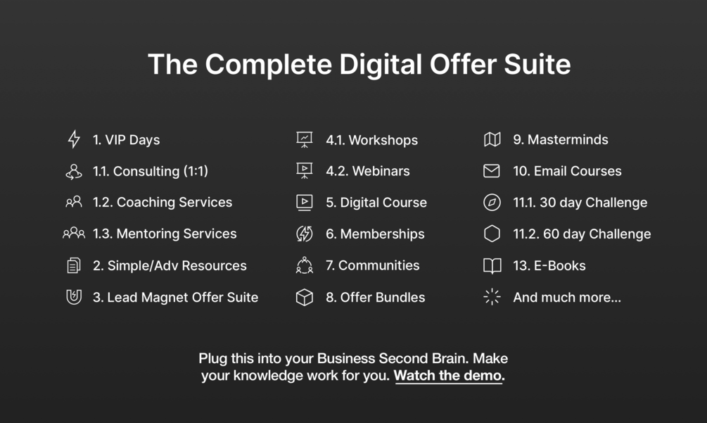 Access 18 specific templates to create 'Intensive Services', '1:1 Consulting', 'Digital Courses', 'Webinars', 'Masterminds', 'Communities', 'Newsletters', and other digital products from scratch.